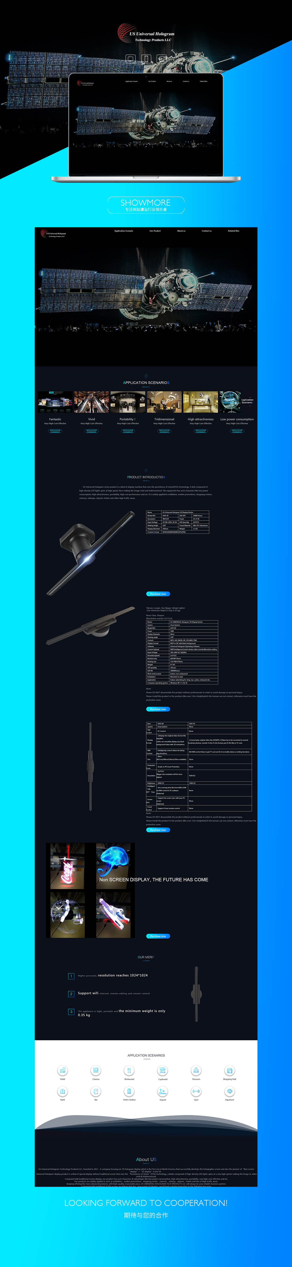 US Universal Hologram series product is a kind of display machine that uses the persistence of vision(POV) technology. A belt composed of high-density LED lights spins at high speed, thus making the image vivid and tridimensional. This equipment has such characters like low power consumption, high attractiveness, portability, high cost performance and etc. It is widely applied in exhibition, market promotions, shopping centers, cinemas, subways, airports, hotels and other high-traffic areas.